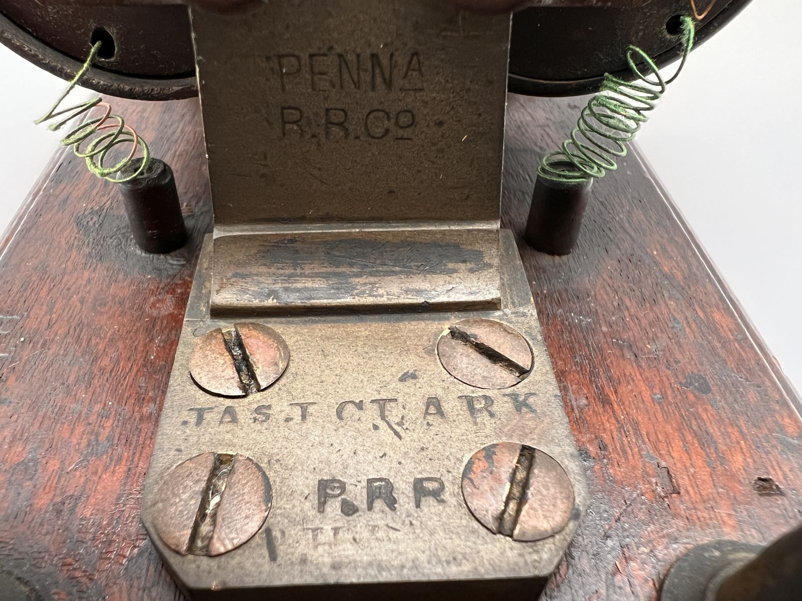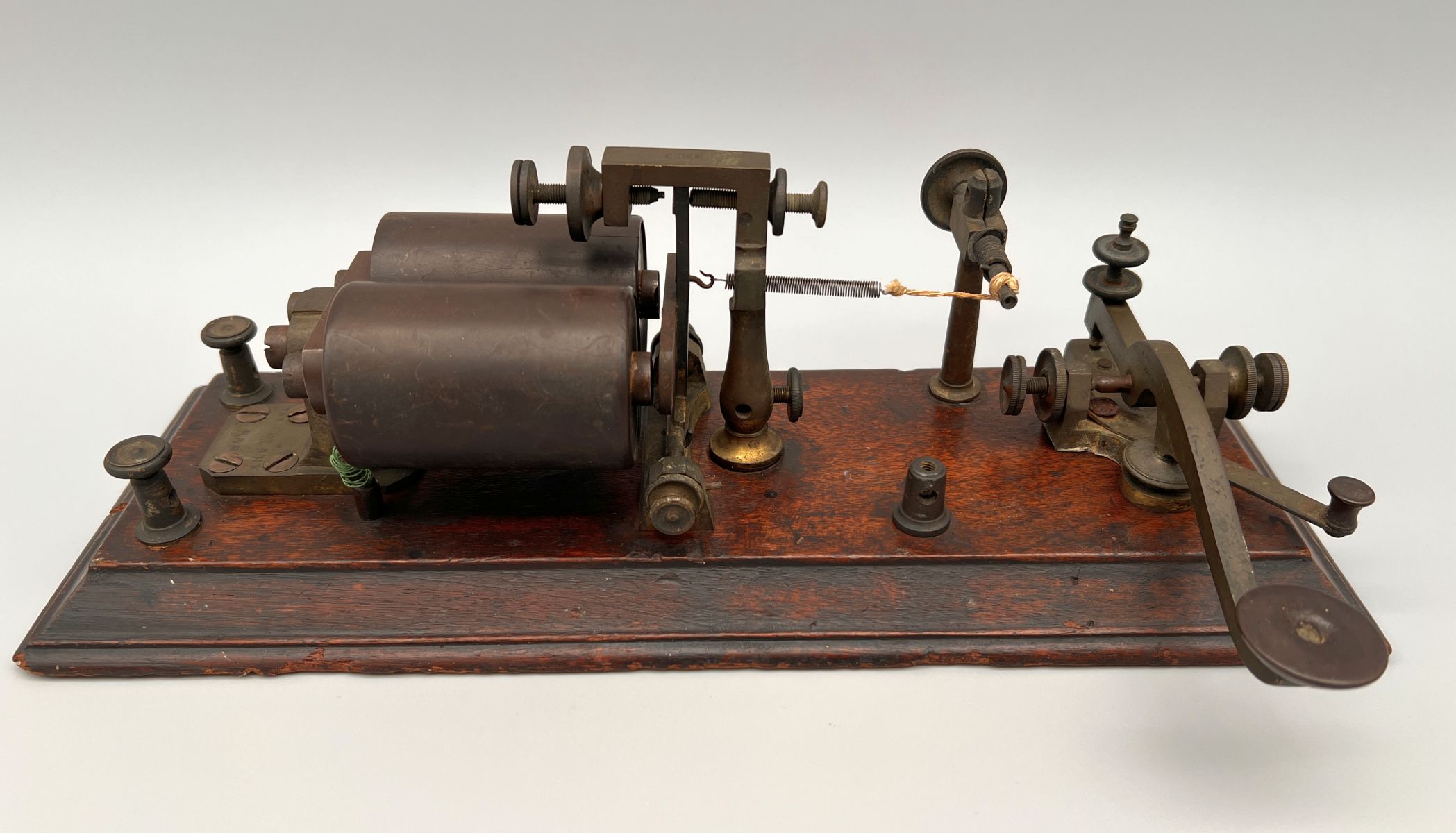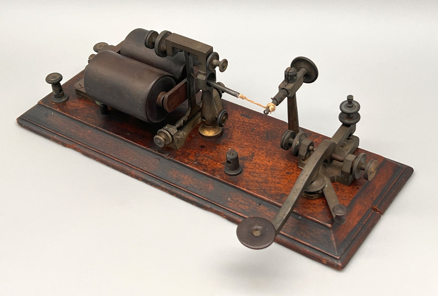 After telegraph communications became more commonplace, many operators learned to read the incoming signal just by listening to the weak clicking sound produced by the register. Soon after this, sometime in the late 1850’s, the sounder was invented. A sounder is an electromagnetic device just like a register and was designed, as the name suggests, to amplify the sound of the lever clicking. The signal passes through an electromagnet, pulling down a lever which hits against an “anvil” and makes a loud clicking noise, much louder than the sound produced by a register. Various neat sounder designs were made over the years, some with very ornate machining. Even after the invention of the sounder, the register was still widely used, especially by the railroads, in order to maintain a record of the communications in the event of an accident.