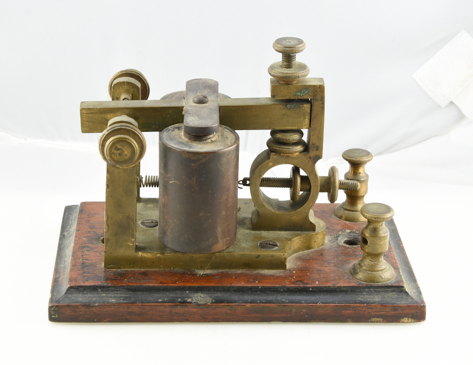 After telegraph communications became more commonplace, many operators learned to read the incoming signal just by listening to the weak clicking sound produced by the register. Soon after this, sometime in the late 1850’s, the sounder was invented. A sounder is an electromagnetic device just like a register and was designed, as the name suggests, to amplify the sound of the lever clicking. The signal passes through an electromagnet, pulling down a lever which hits against an “anvil” and makes a loud clicking noise, much louder than the sound produced by a register. Various neat sounder designs were made over the years, some with very ornate machining. Even after the invention of the sounder, the register was still widely used, especially by the railroads, in order to maintain a record of the communications in the event of an accident.