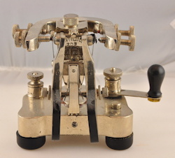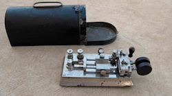 This is the double-lever Dunduplex. Note the black plungers on top of the frame that are marked with a dot or dash symbol. The "Dash" plunger operates like a simple hand key, while the "Dot" plunger actually causes the pendulum to move just as if the dot paddle was moved. The Dunduplex came with a unique metal carrying case that was shaped like a mailbox.