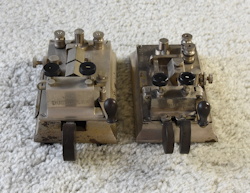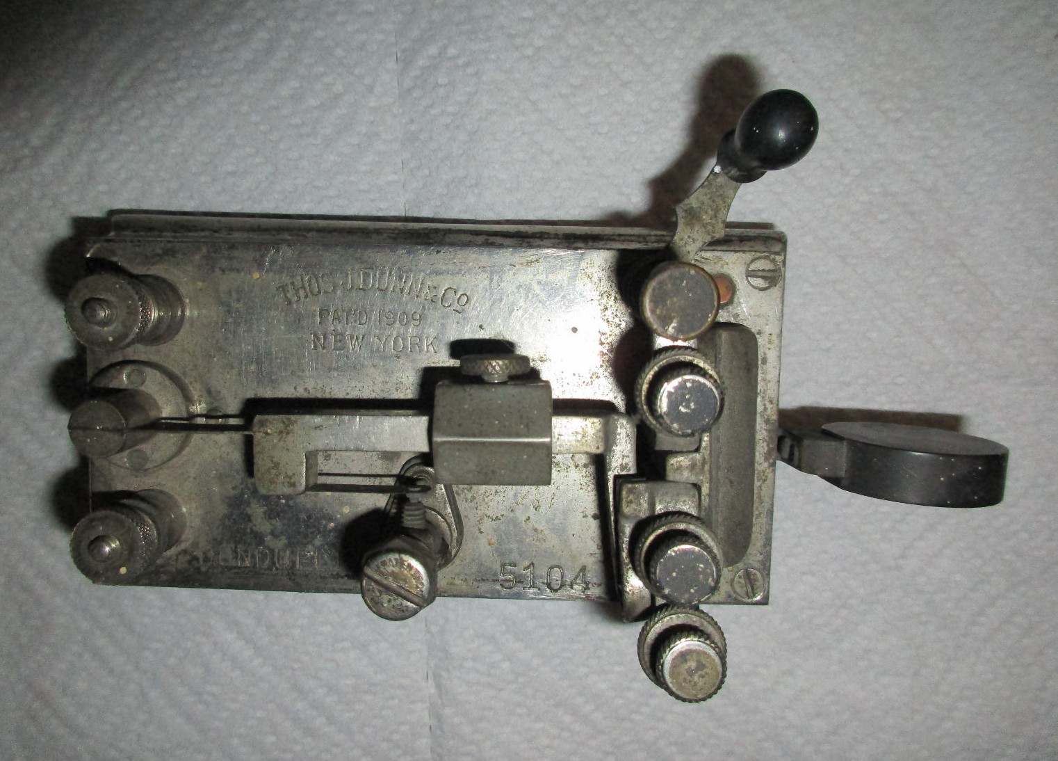 Later, Dunn changed the design of the single-lever key to eliminate the plungers. The problem with the plungers is that they could fall out of the key if it was turned upside down. It is not uncommon to see Dunduplex bugs that are missing one or both plungers. So the plungers were replaced with knurled thumbscrews which accomplished the same thing.