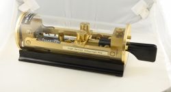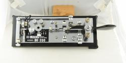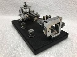 This is one of the earlier GHD bugs, the GD-131. It is a double-lever bug that operates without the use of mechanical contacts, instead using optical sensors to detect the keying. Very little force is required to move the lever; hence it can operate with a single small weight. Also, the damper assembly has a metal catch that, when hooked over the pendulum, converts the bug to an iambic keyer paddle !