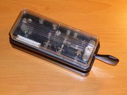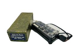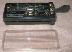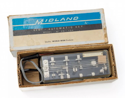 The most common Japanese bug by far. Surely every key collector owns one and nearly every ham has used one. The BK-100 is also called the "Coffin Bug" because of its rectangular shape and cover. Although they were all made in Japan, several companies sold the same key under a different brand name. On the bottom row are 4 of these "after market" keys, made by Monarch, Lafayette, Calrad, Midland and Eagle Products.