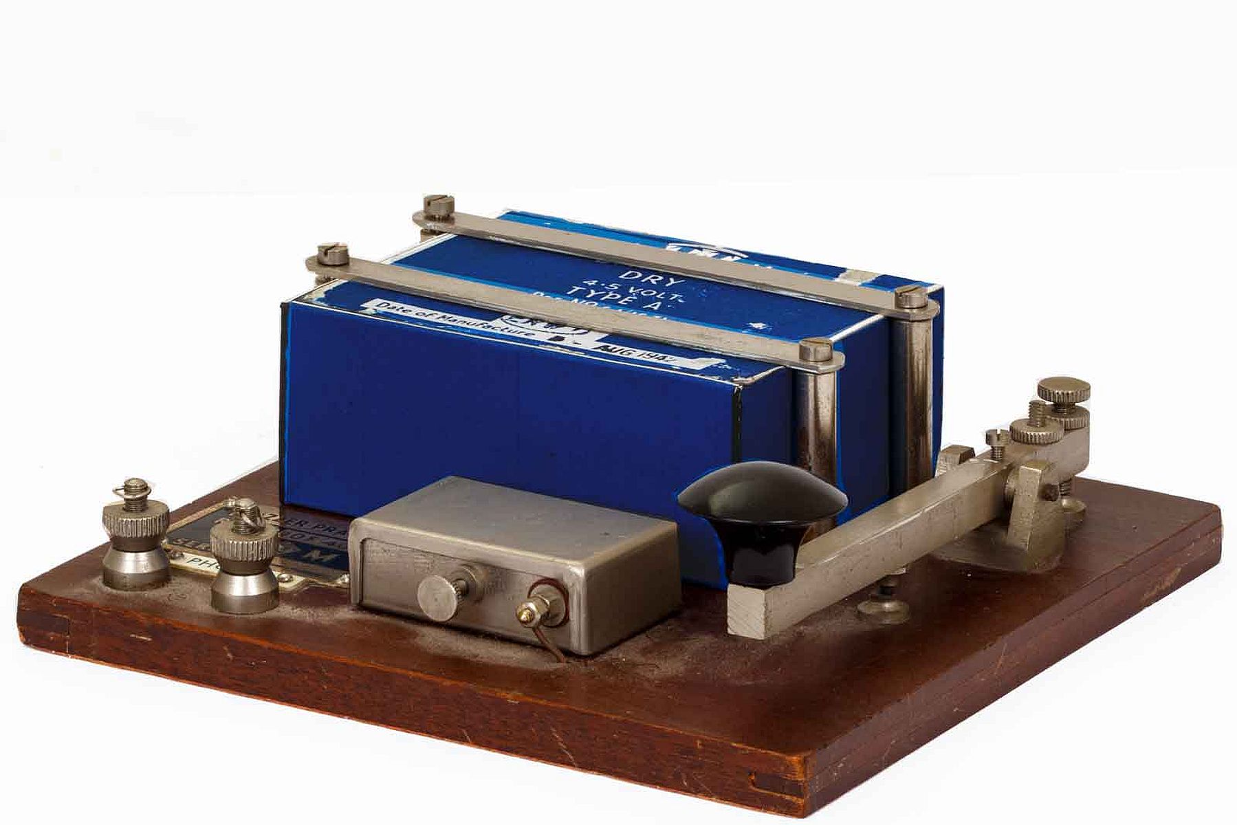 | The Key & Buzzer Set Includes a French Made Microphone and Earpiece so the Set Can be Used Like a Telephone | The Walters Key & Buzzer Set With the Cover Removed to Show the Buzzer | Radio Key by A. Mason, Surrey England | Walters Electrical Model 18K Postal Key With Leaf Spring Pivot |