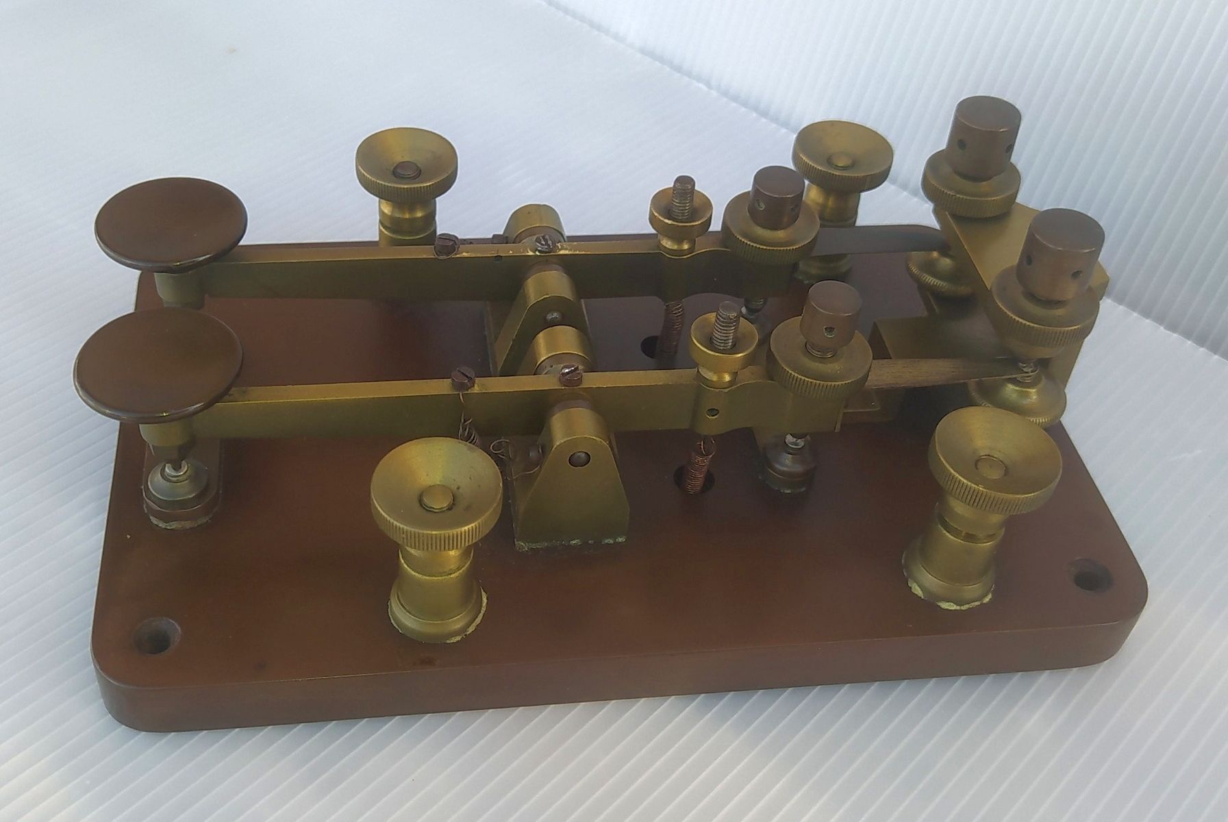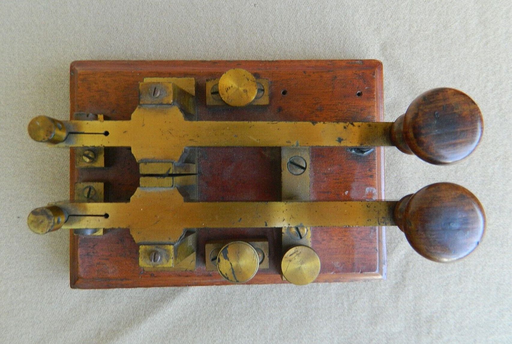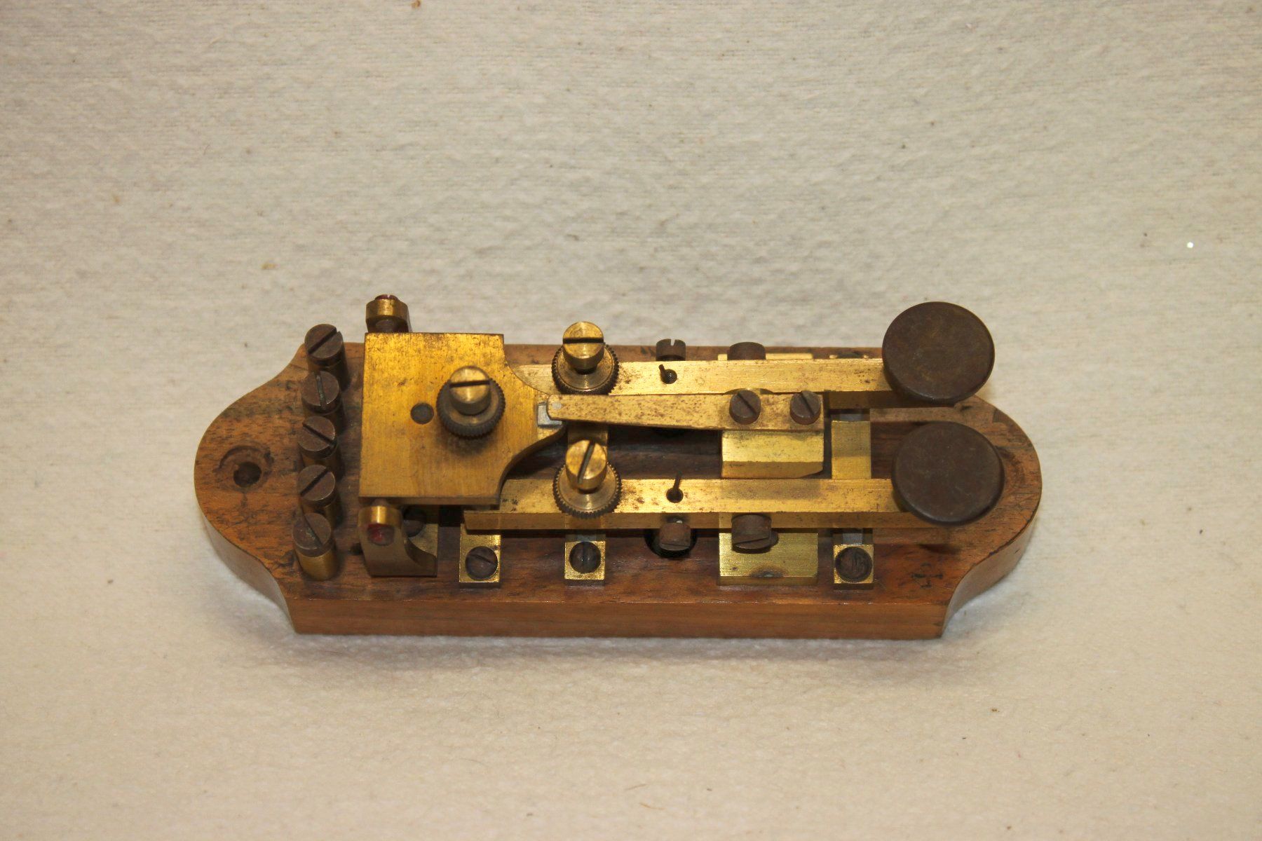 1. A cable telegraph key will have a contact at the front and at the back of each of the 2 key levers and on the base. OR if there are no rear contacts on the key, the key will have a metal contact bridge over the 2 key levers with a contact screw for each lever.