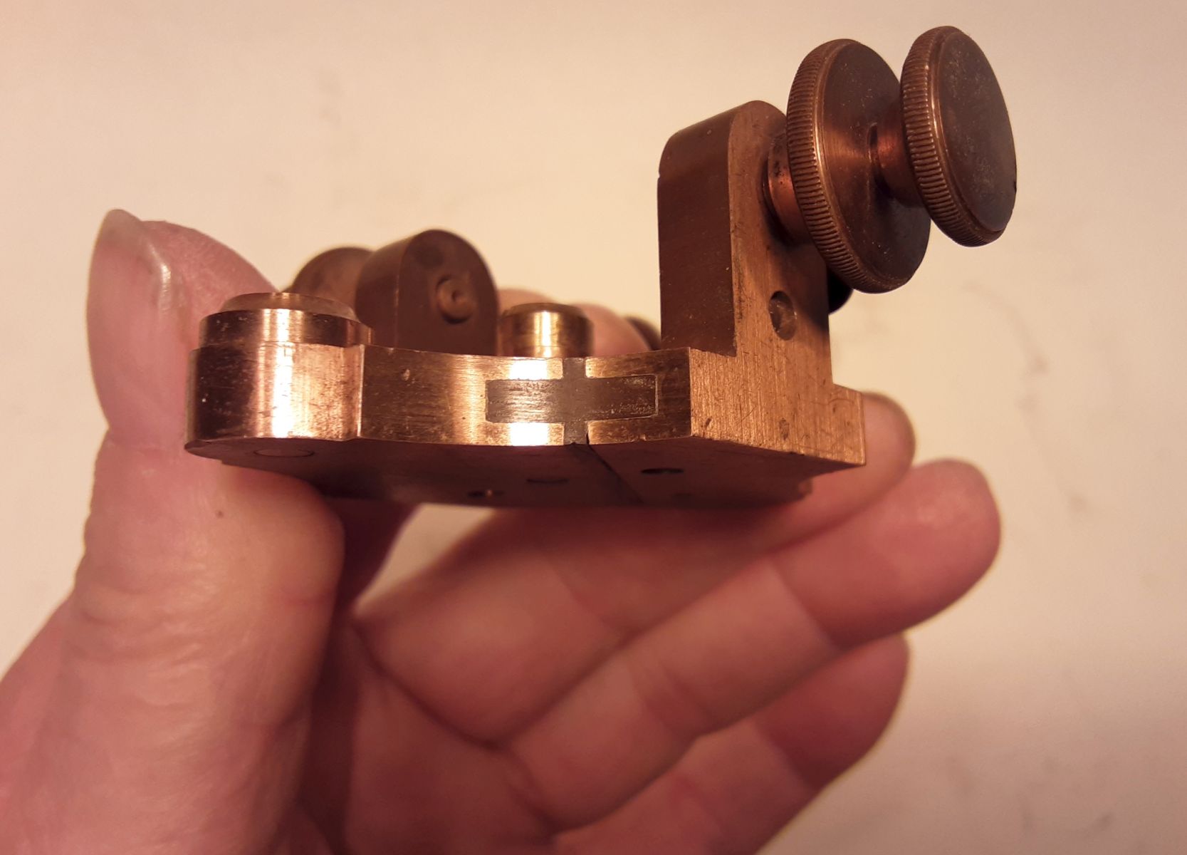 A Very Unusual Legless Key by George Bliss That Uses No Binding Posts. Two Halves of the Key Base Are Insulated From Each Other With a Hard Rubber Insert (Gil Schlehman, K9WDY Collection) |