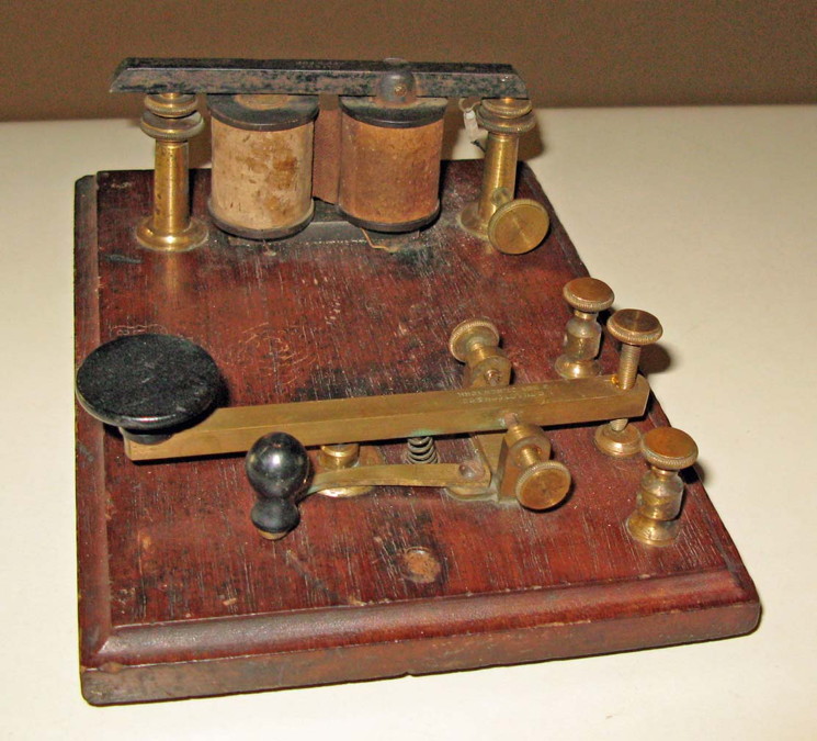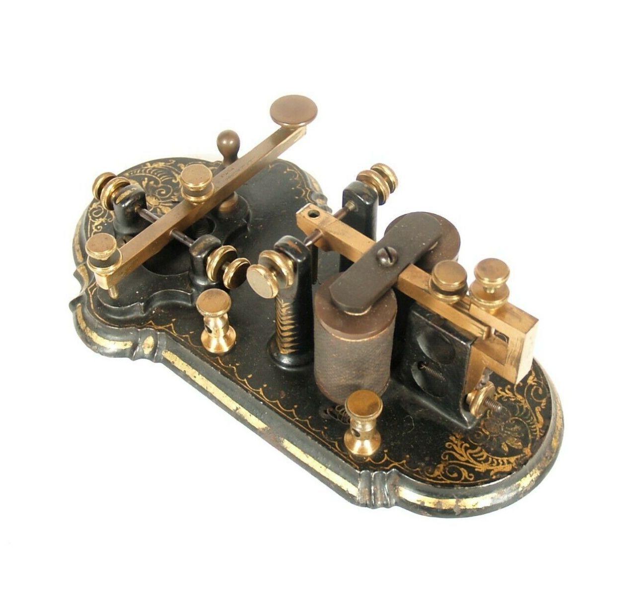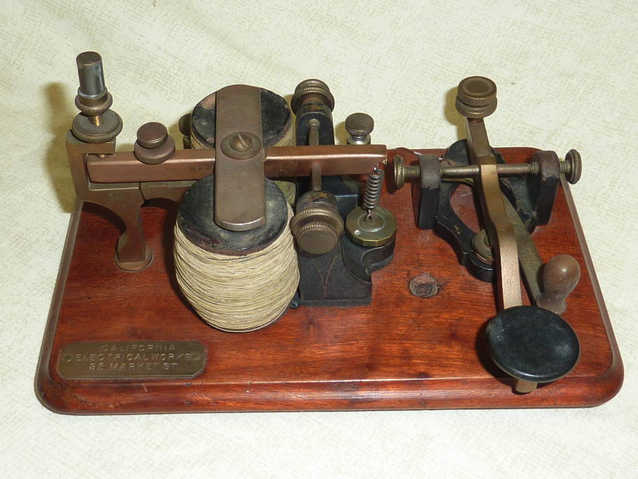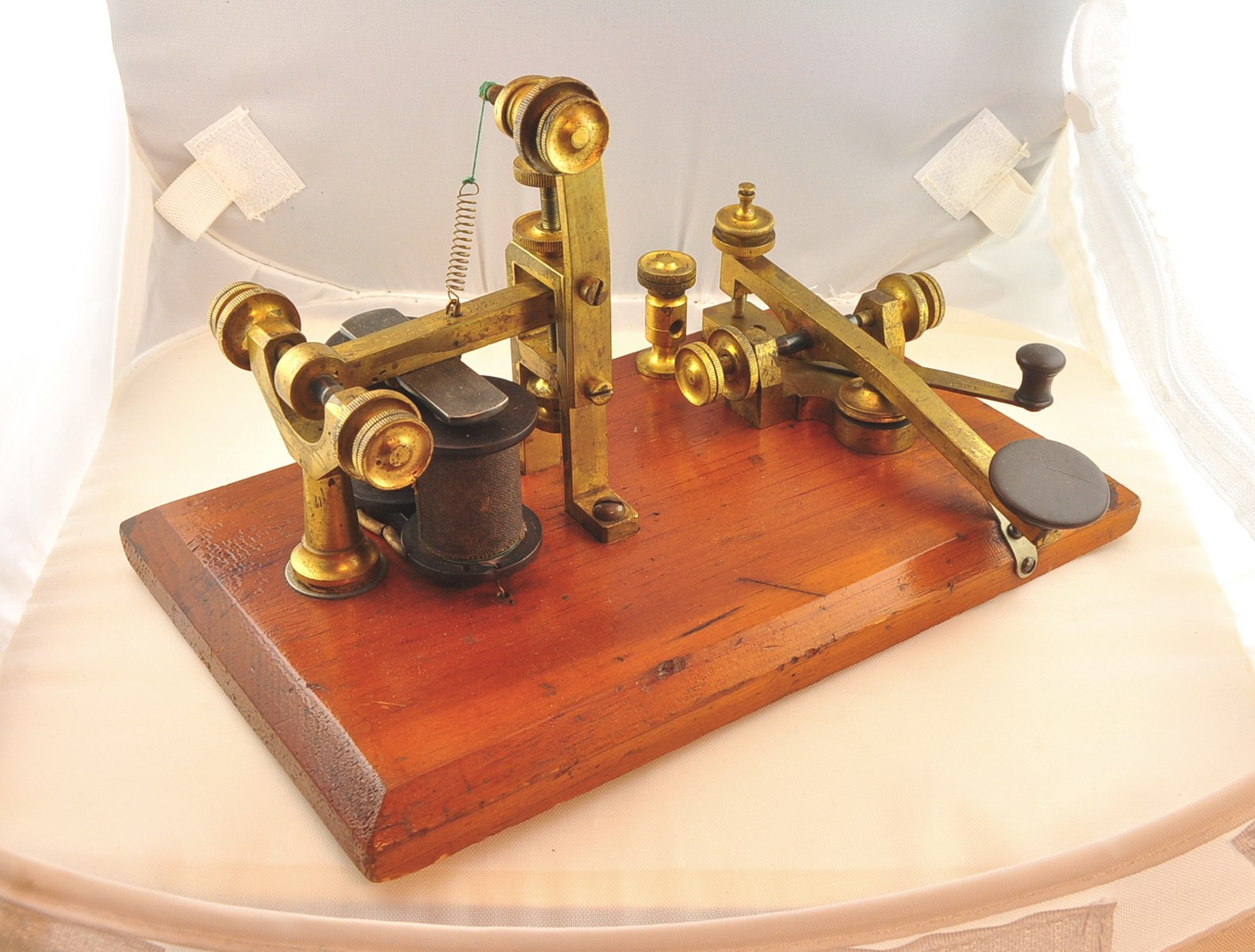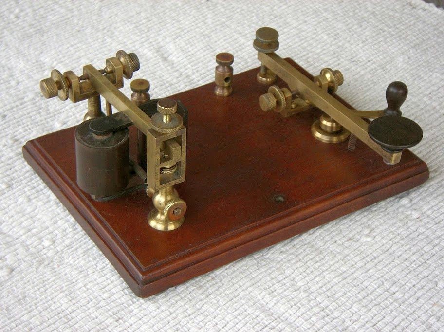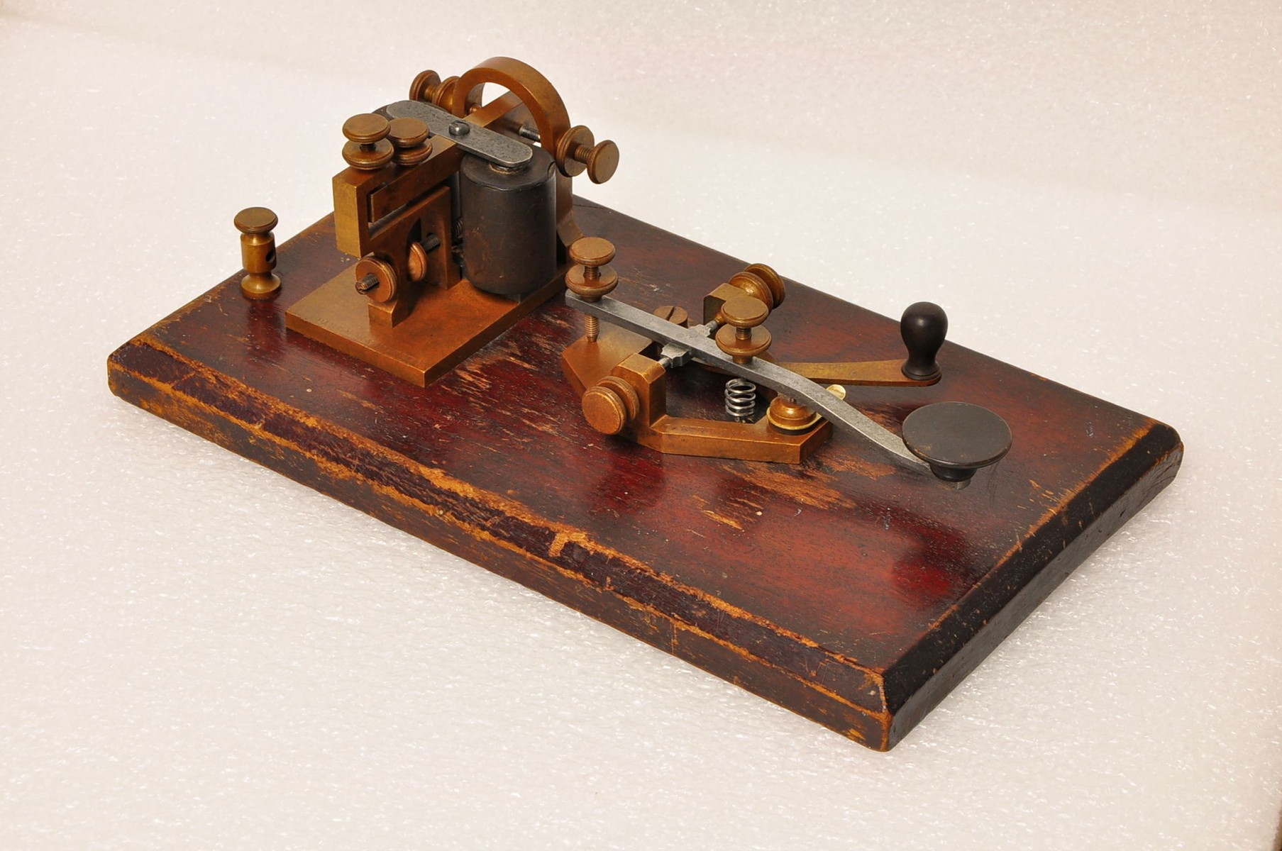 KOB stands for Key On Board. A KOB has a key and a sounder mounted on a single base. The first KOBs appeared in the 1860's. Before that, the individual components of a telegraph office, such as the key, sounder, and relay, would be mounted separately on the operator's table.