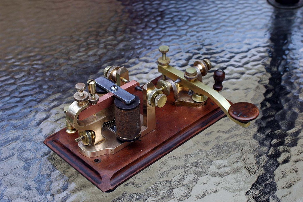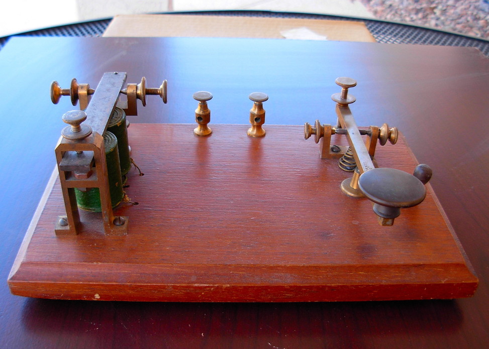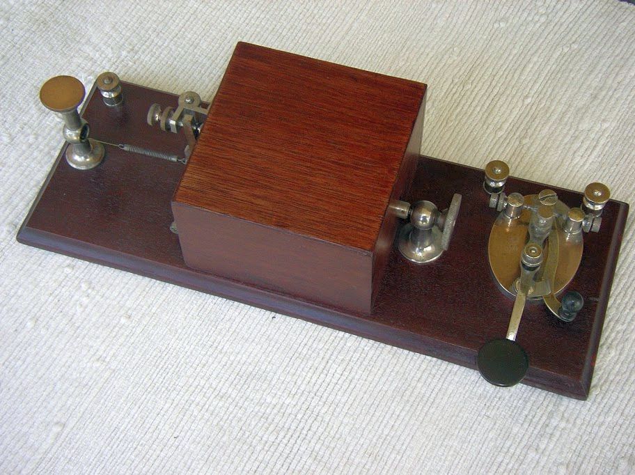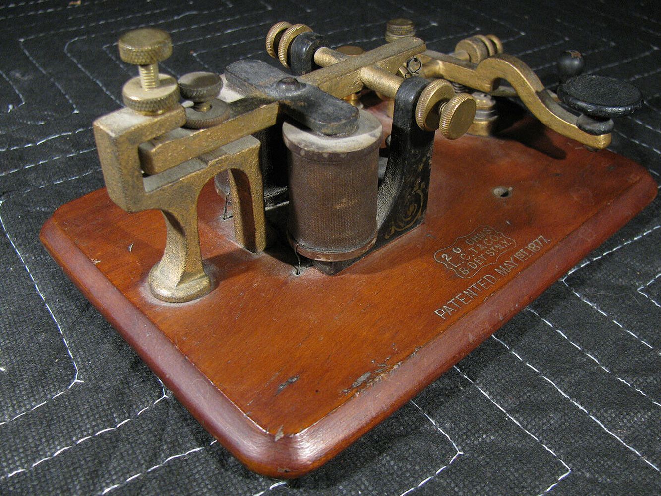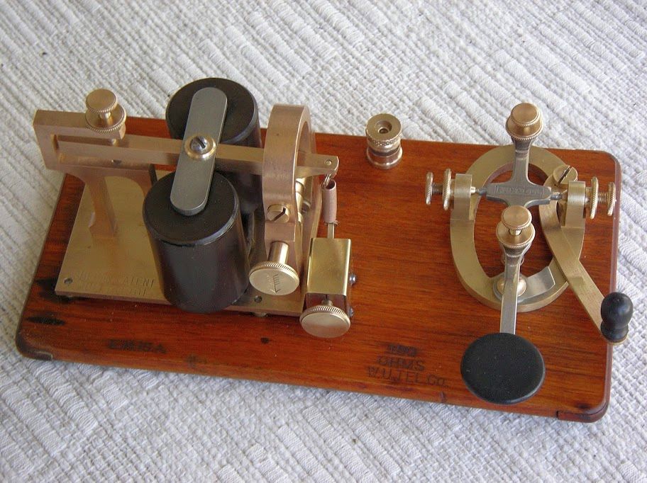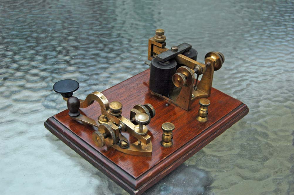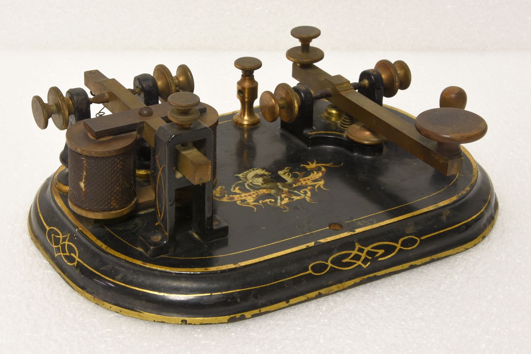 KOB stands for Key On Board. A KOB has a key and a sounder mounted on a single base. The first KOBs appeared in the 1860's. Before that, the individual components of a telegraph office, such as the key, sounder, and relay, would be mounted separately on the operator's table.