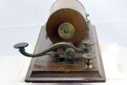 | Box Relay With Small Camelback Key. LG Tillotson, NY. Ca. 1872 | Side View of the Tillotson Box Relay Showing the Camelback Key | California Electrical Works Cylindrical Box Relay, San Francisco. Ca. 1870's | A "Fake" Version of the Cal. Electrical Works Cylindrical Box Relay Made to be Used as a Prop in Hollywood Movies. Several of These Units Were Produced |