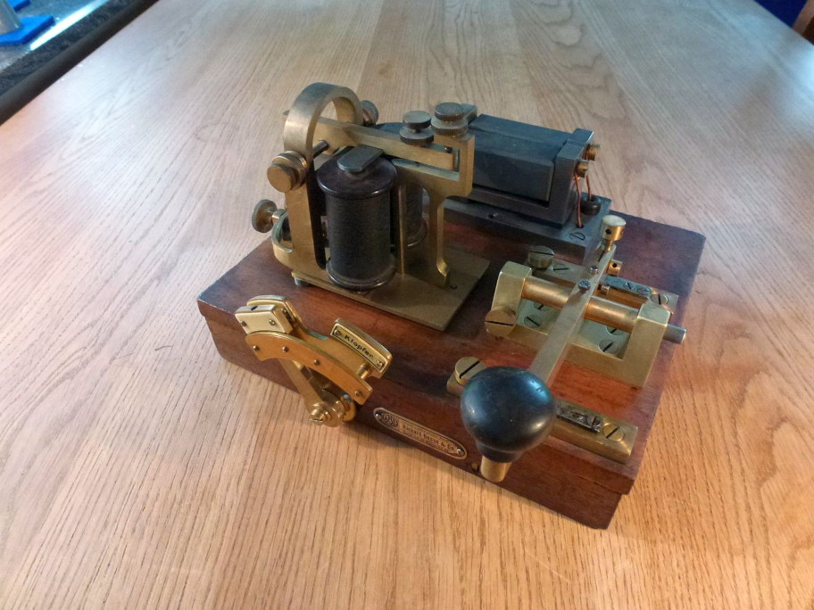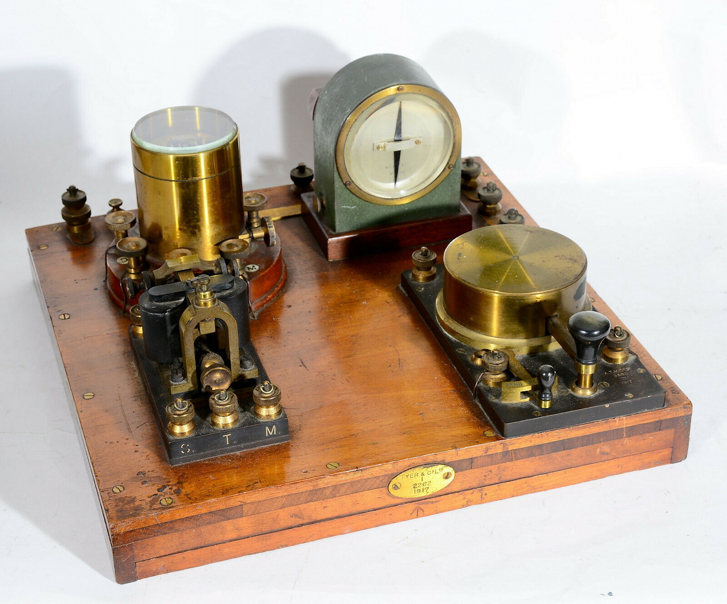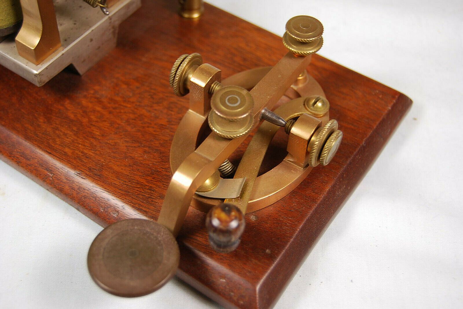 | European Mini KOB. Maker Unknown. Ca. Early 1900's | British Baseboard Set With Key, Sounder, Relay, and Galvanometer. Tyer & Co. Ltd. 1917 | Another View of the Tyer Baseboard Set | Edison-Swan Key-Sounder-Galvanometer Set. |