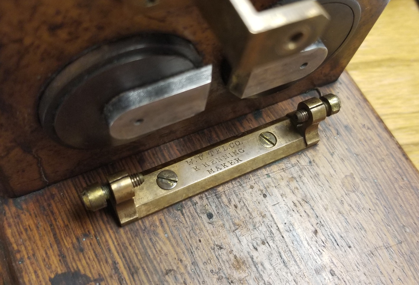 | Another View of the Henning Box Relay | Top View of the Henning Key | Henning Name Stamped on Armature Frame | A Later Nickel Plated Henning Box Relay Made After the Caton Instrument Shops Merged With Western Electric. Early 1870s |
