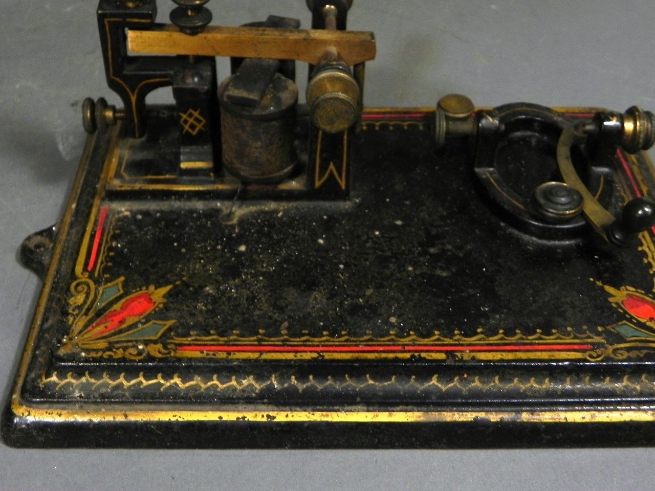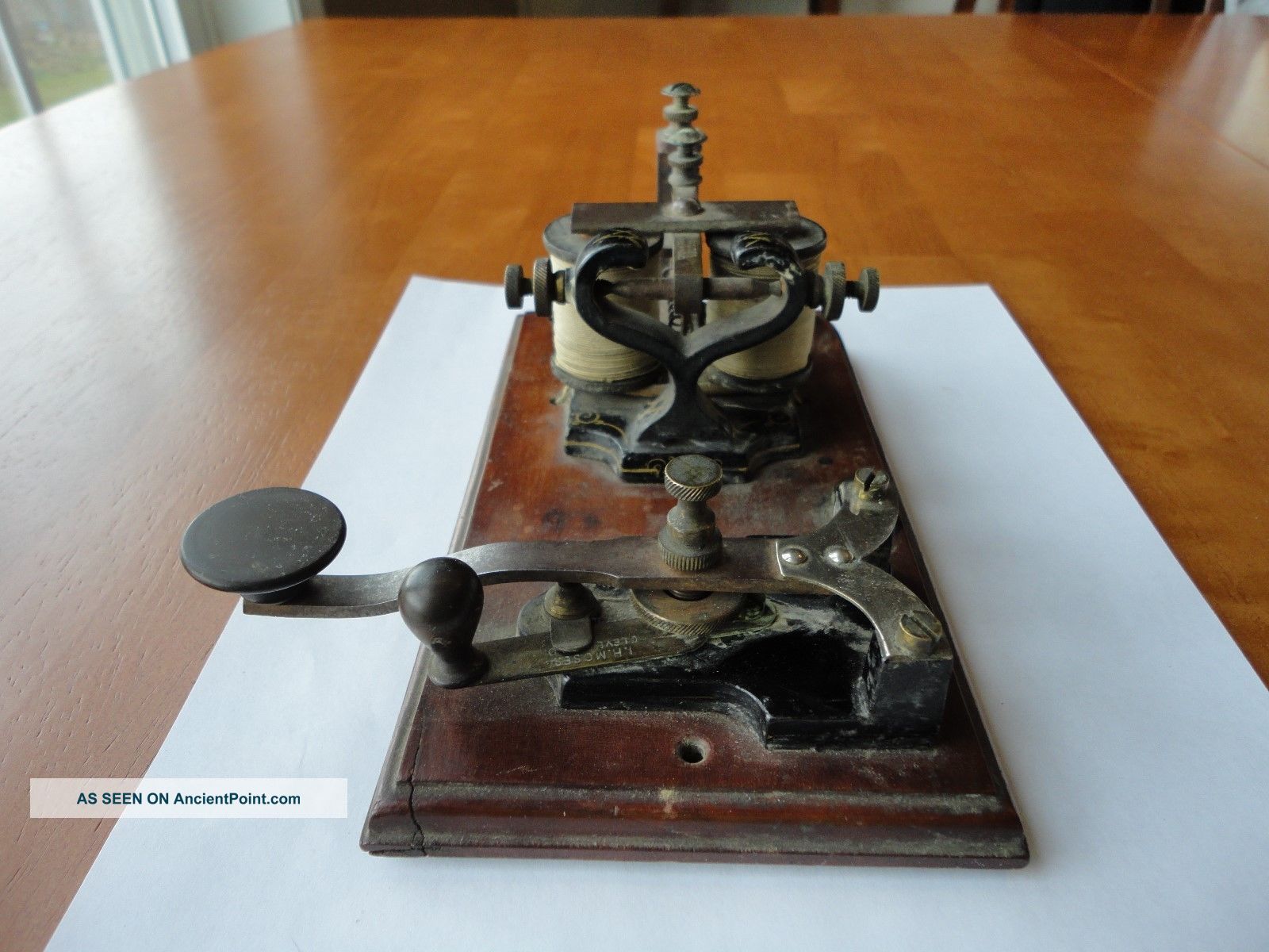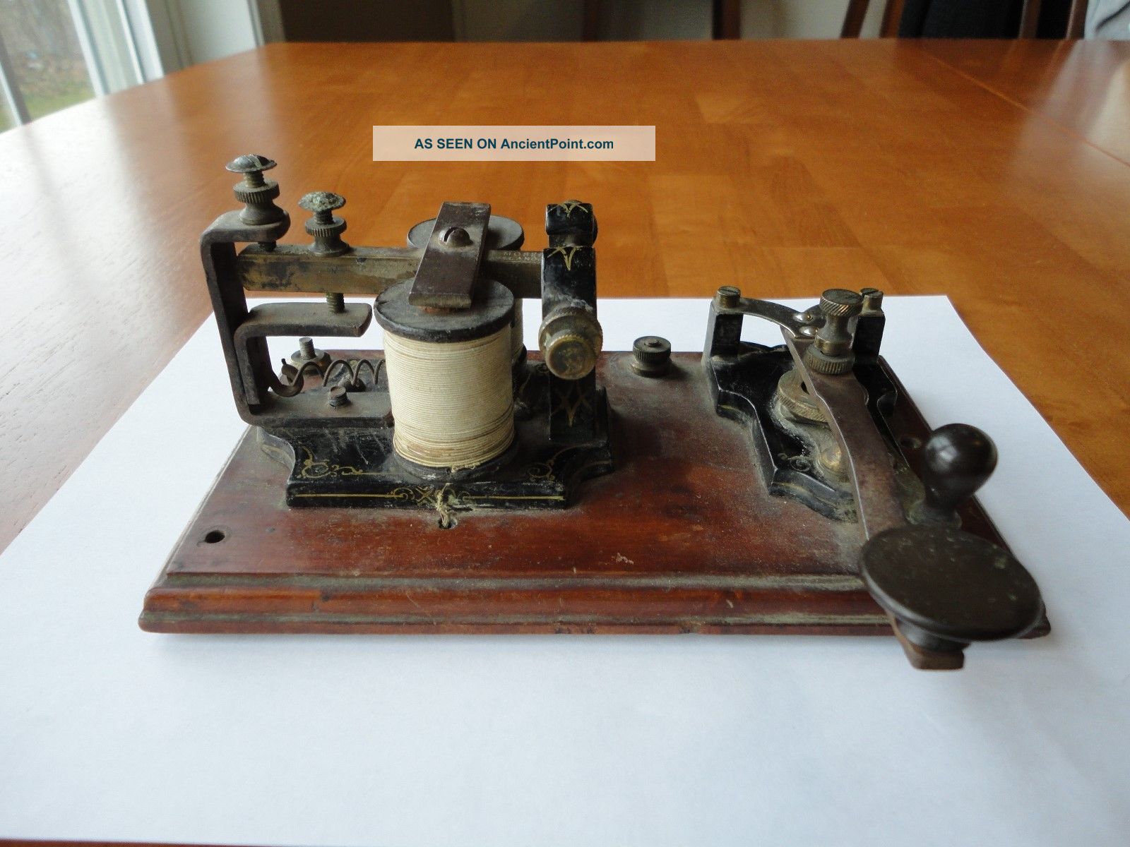 | Another "Eureka" Practice Set. This one Was Made by W.B. Cleveland, Cleveland, Ohio | Cast Iron Private Line Set by Jerome Redding, Boston. Ca. 1870's | Combination Set Consisting of a Key, Sounder, and Relay by Watts & Co., Baltimore. Ca. 1870's | Another View of the Watts Combo Set |