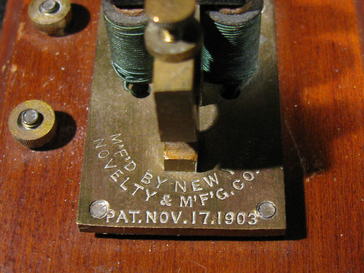 | Novelty Electric Mini KOB, NY. Ca. 1904 | Another View of the Novelty Electric Mini KOB | Close-Up of the Novelty Electric Name and Patent Information | Novelty Electric KOB with Regular Size KOB |