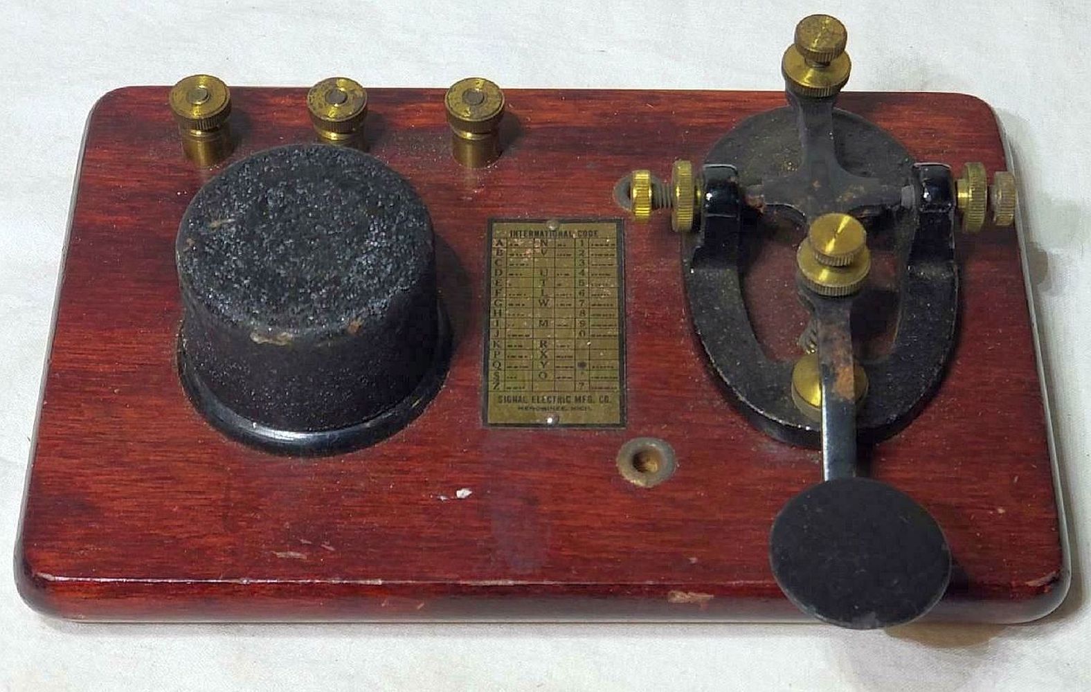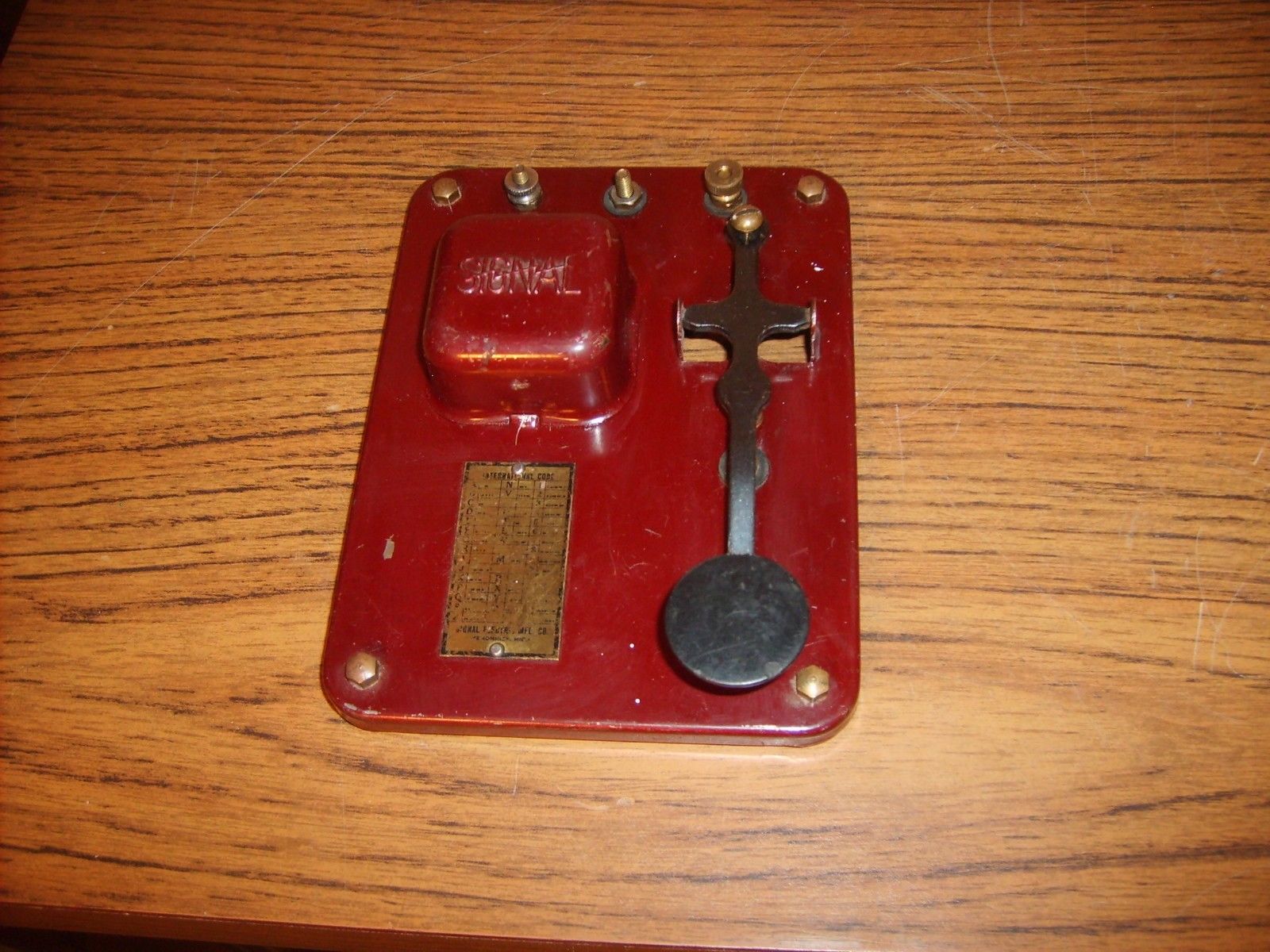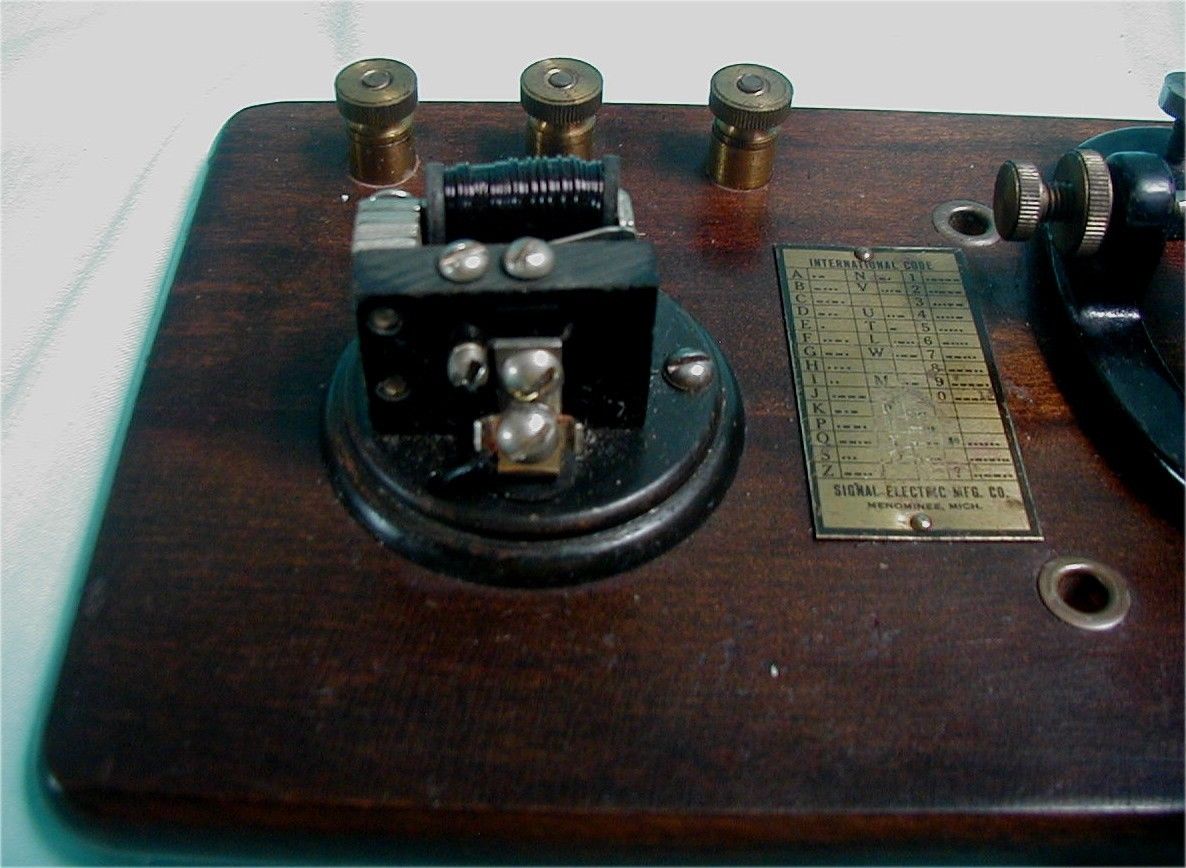 | A Rear View of the Western Union Portable Set Showing the Western Union Logo | KOB by Signal Electric Mfg. Co. Menominee, Michigan. Ca. 1920 | Signal Electric R-68 Practice Set With Buzzer and Morse Code Plate | Close-up of the R-68 Buzzer |