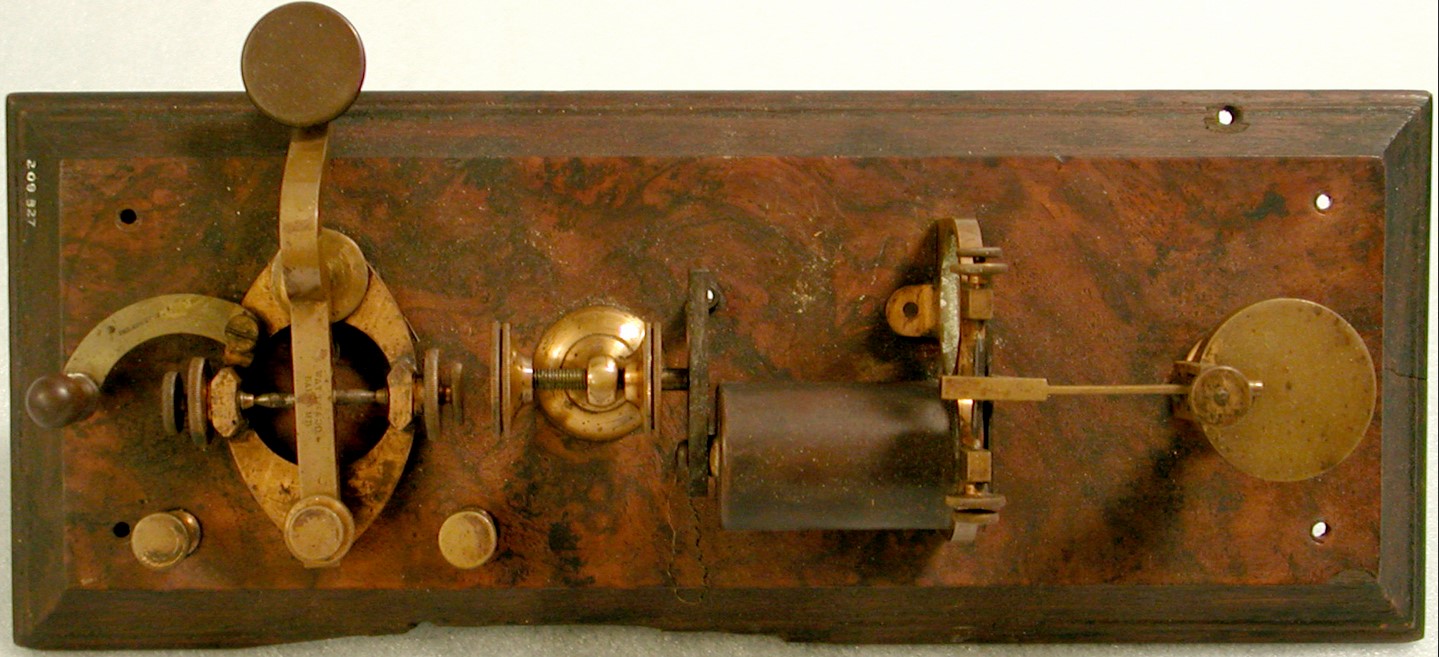 | Another View of the Altoona Box Relay Showing More Details of the Key | Close-Up of the Brass Button on the Altoona Box Relay Base, Showing the Coil Resistance, Which Strangely is Shown in "Siemens Units" Rather Than "Ohms" | An Unusual KOB With a Camelback Key and Drum Sounder. Made by Watts & Co, Baltimore, Maryland. Early 1870's (Smithsonian Museum) | Top View of the Watts Drum KOB. (Smithsonian Museum) |
