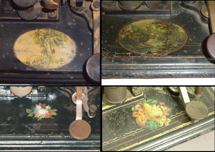 | Western Electric Lewis Key PL Set. Ca. 1870's | Ornamental Paint Variations on Western Electric Lewis Key PL Sets | Altoona Railroad Shops Box Relay, Altoona, PA. Ca. Early 1870's | A Similar Altoona Railroad Shops Box Relay, This One With More Ornate Hardware. Early 1870's |