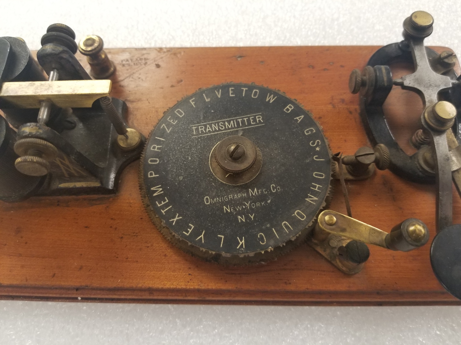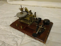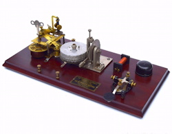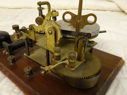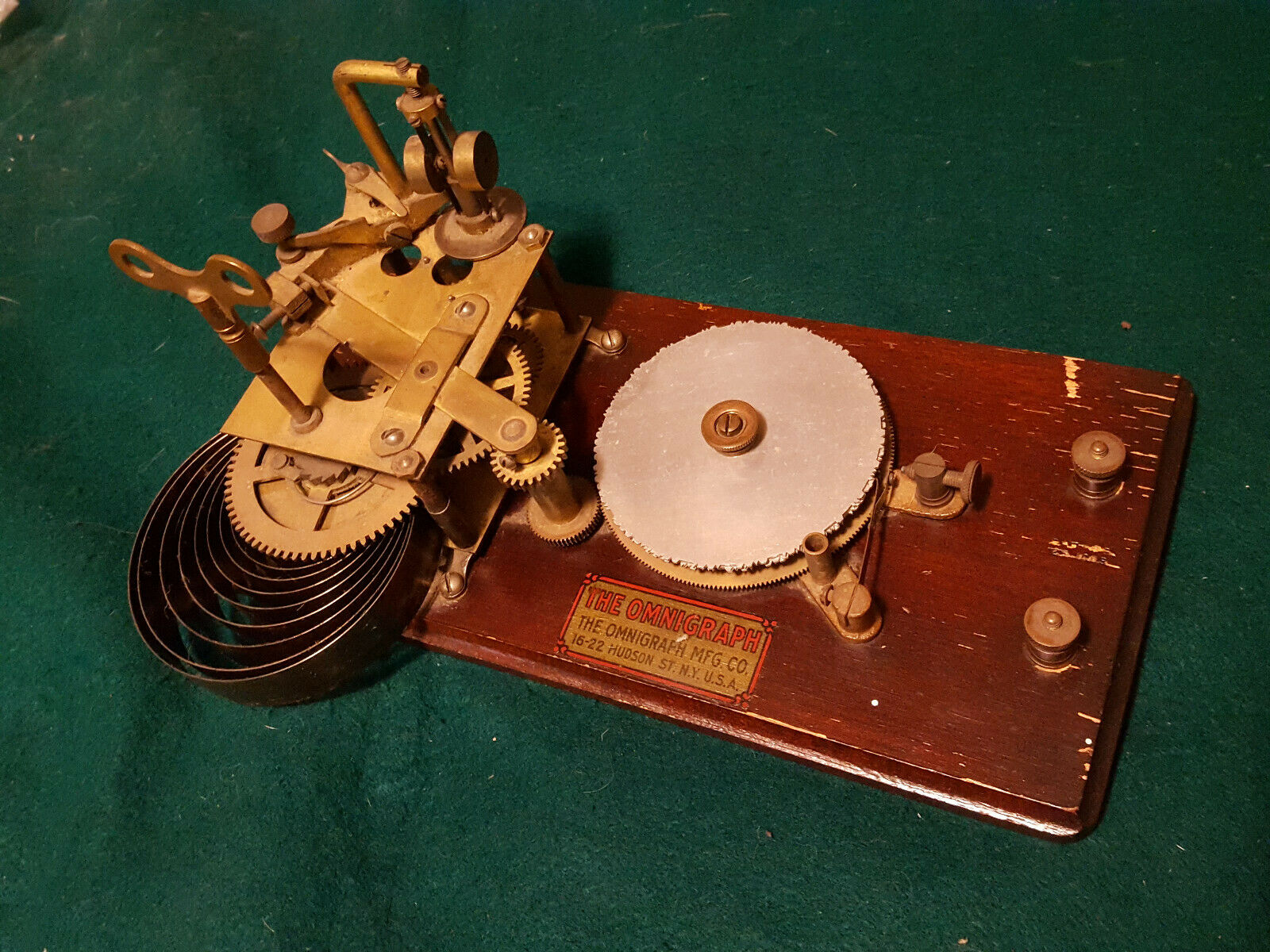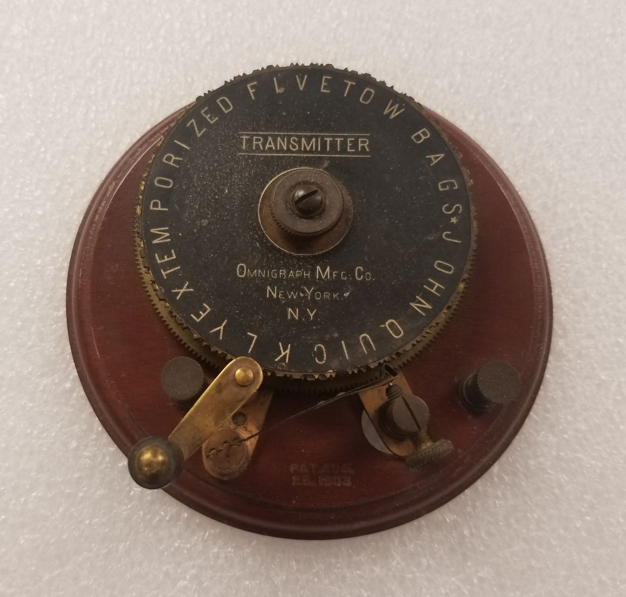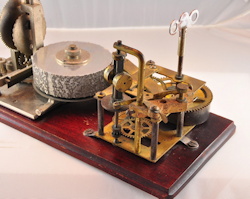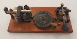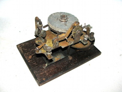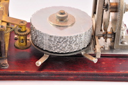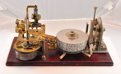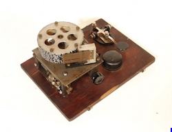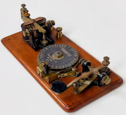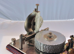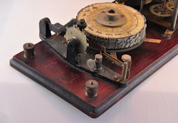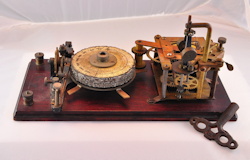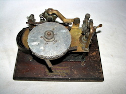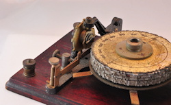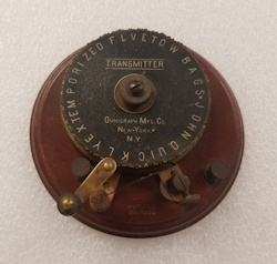 The first Ominigraph model, called The Omnigraph Transmitter #1, was also the most simple. It consisted of a single notched metal disc that was manually turned with a small cranking handle. The disc was mounted on a round wooden base with 2 binding posts that were connected to a telegraph sounder and battery. As the handle was turned, a contact strip moved along the notched wheel. The "bumps" on the edge of the notched wheel caused this contact strip to touch a second contact mounted on a fixed post. This completed the circuit and the sounder produced an audible sound corresponding to the Morse Code characters along the edge of the disc.