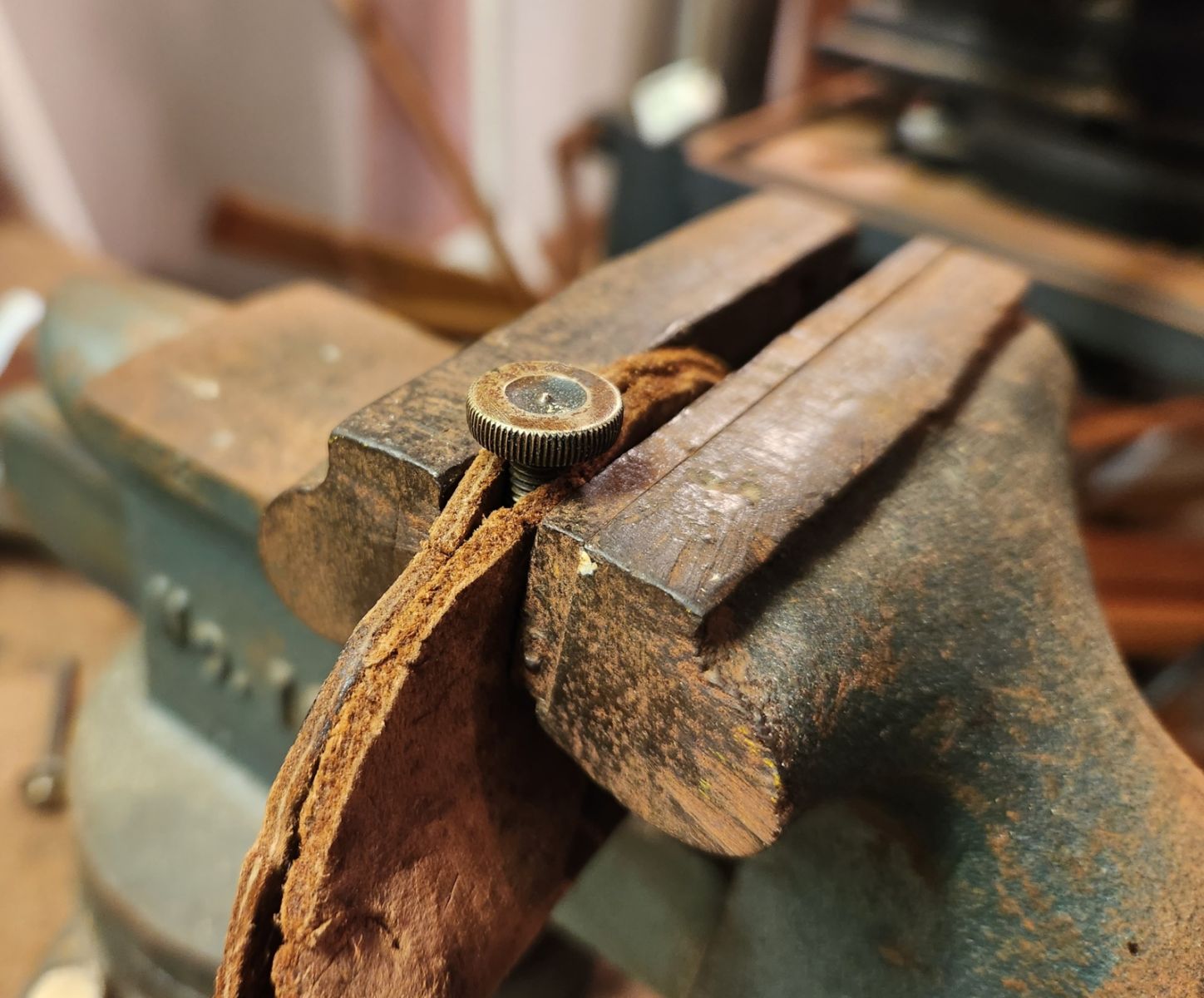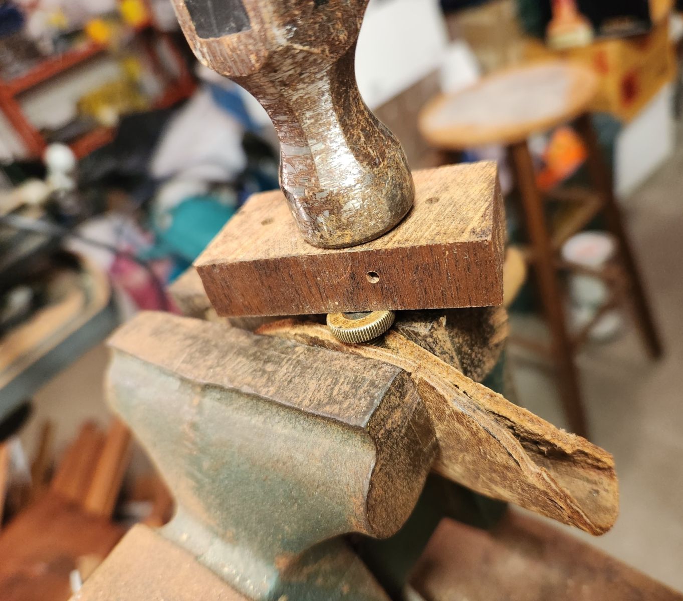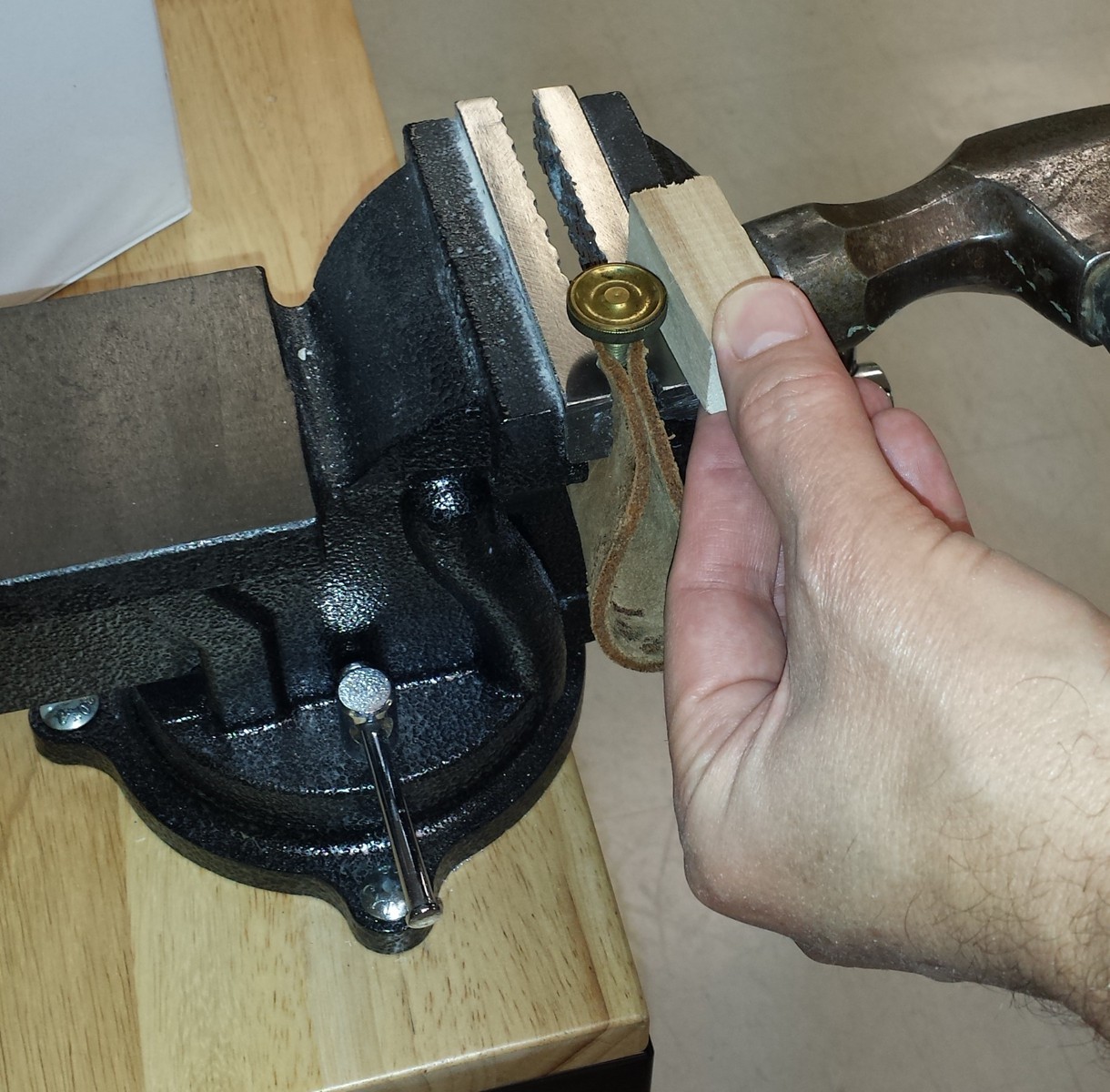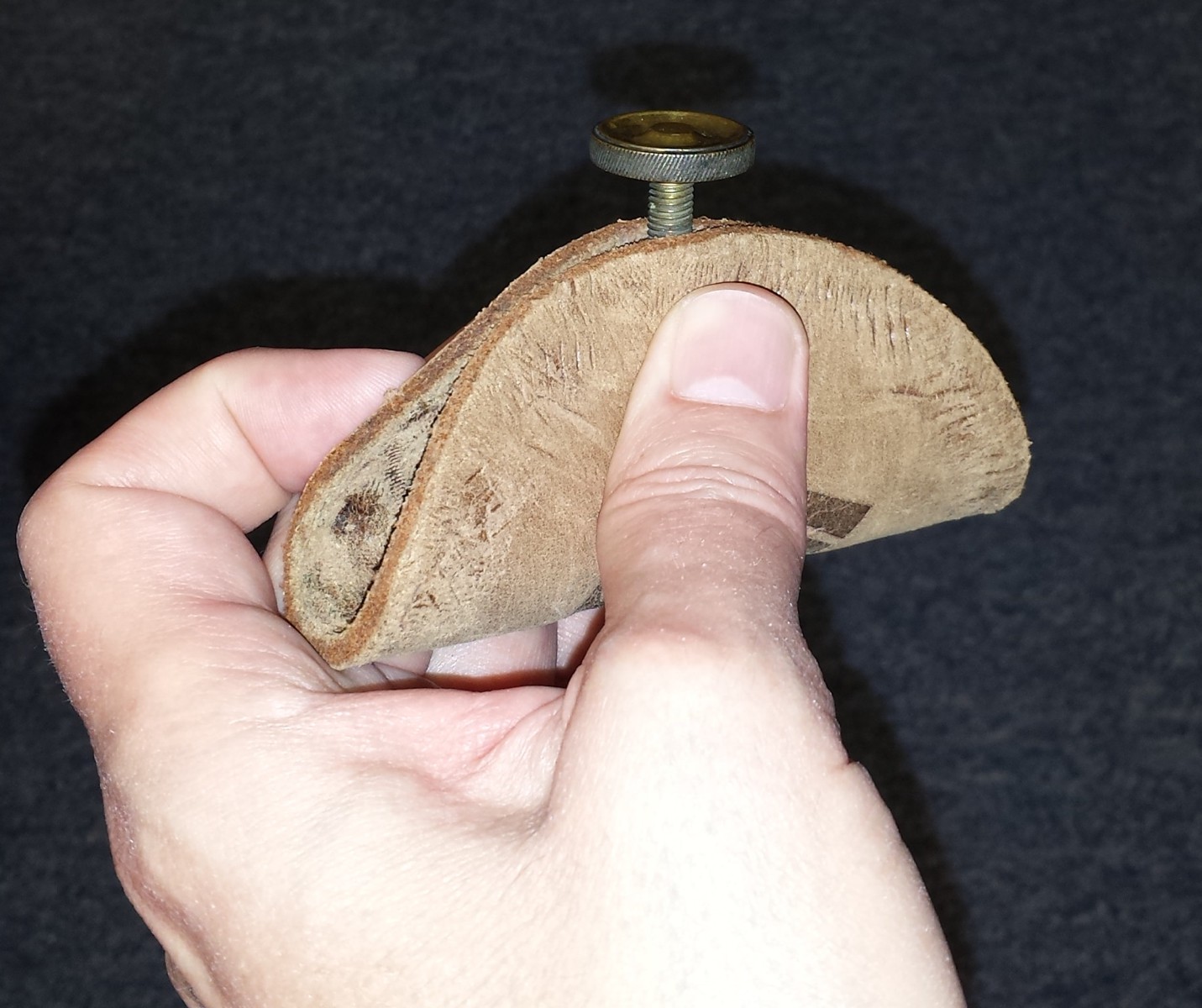 The pictures below illustrate the proper use of the leather and wood block to avoid damage to the screw knurls and threads while straightening the part. (The screw used in the example is not actually bent. I'm just using it to demonstrate the set-up procedure):