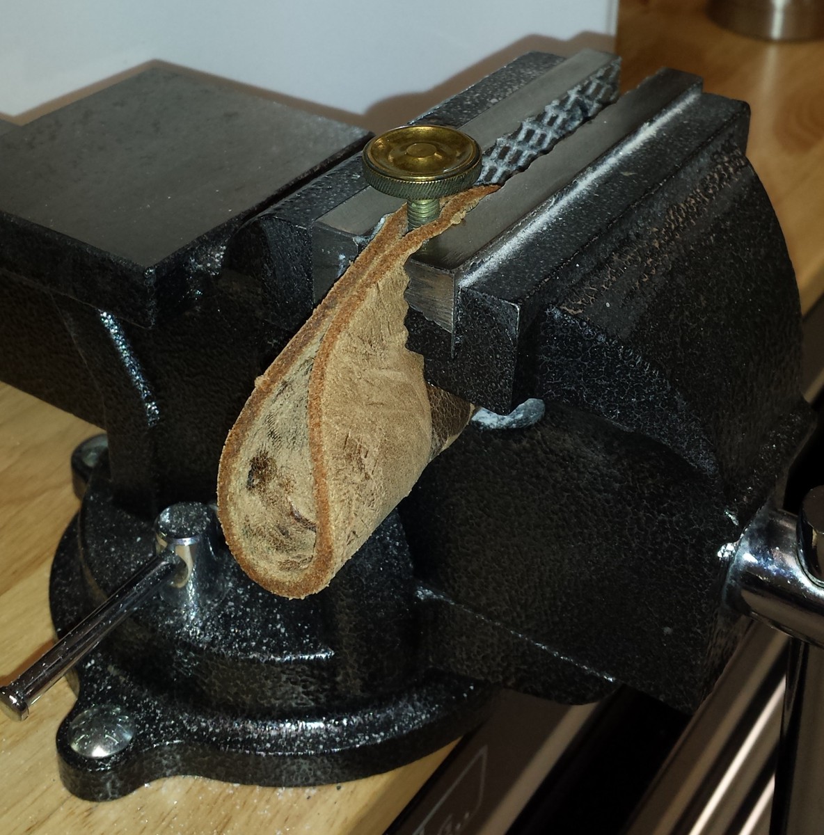First, take one of your leather drink coasters and fold it over on the screw threads, with the top edge of the leather aligned approximately with the point the bend starts. (Remember, we use these leather drink coasters to prevent damage to the screw threads and knurls). Then clamp this tightly into the vise with the top edge of the leather (and the start of the bend) lined up with top edge of the vise.
