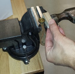 Now get a small block of wood and hold it against the knurled screw head on the side that is bending towards the block. The wood block will prevent the knurls from getting damaged. Hit the wood block lightly with the hammer then start increasing the force of the blows slowly until you notice a change in the position of the screw head. Now give a few more blows with this same force until the screw head is in the upright position.