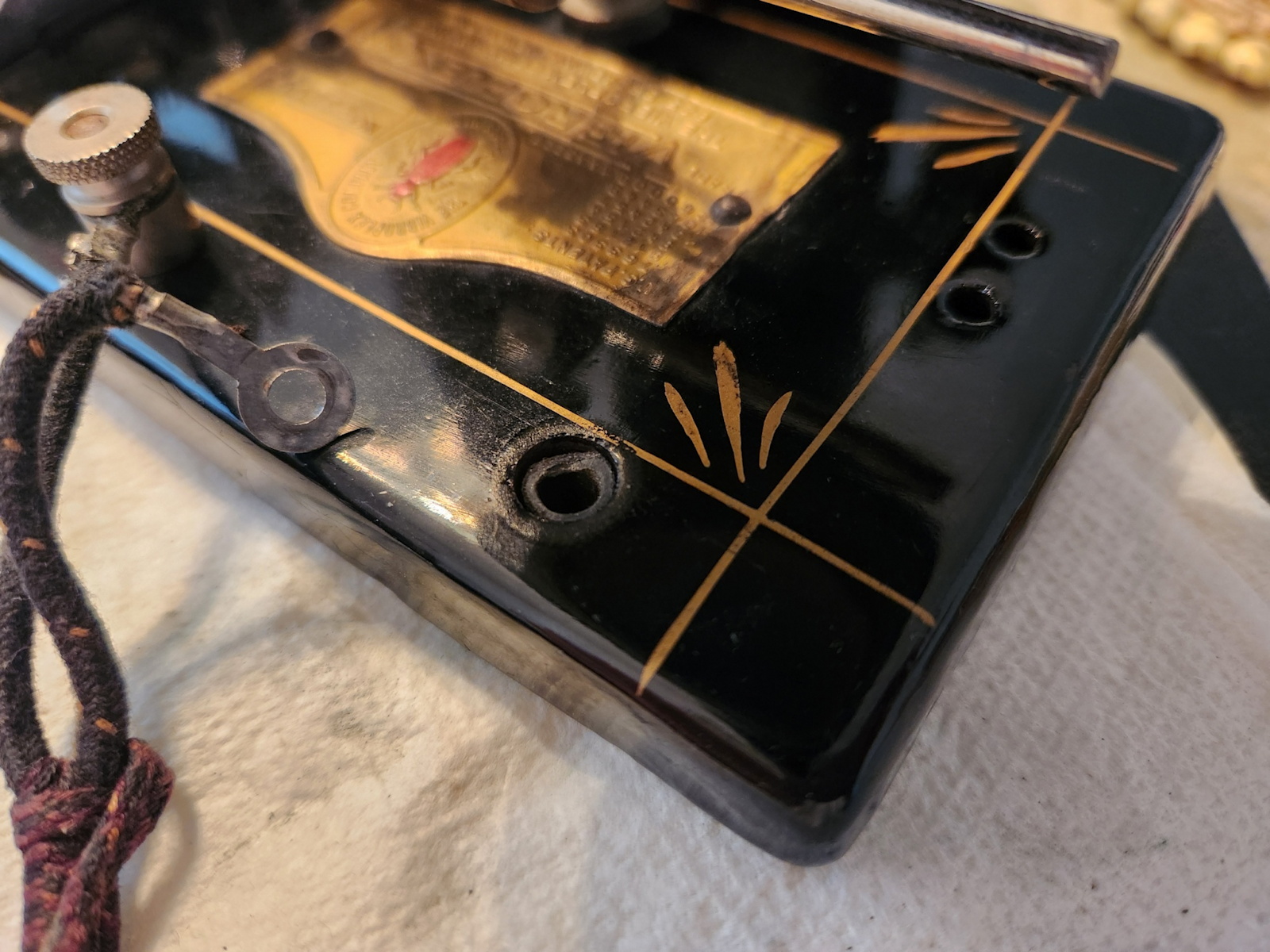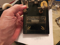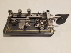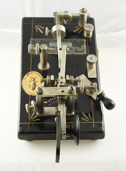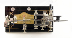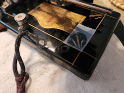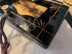 From the time that Vibroplex production started in 1905 until the late 1930's, the standard finish for Vibroplex bug bases was the "Japanned" finish. The steel base was coated with a thick layer of black lacquer paint, then finished with ornamental gold filigree, consisting of gold pinstripes near the edges, and gold "florets" in the corners. Sometimes a collector may get lucky and find one of these keys with perfect filigree, but more often than not some or all of the gold lines and florets have worn off due to excessive use of the key. This page will explain how the filigree can be restored on one of these keys.