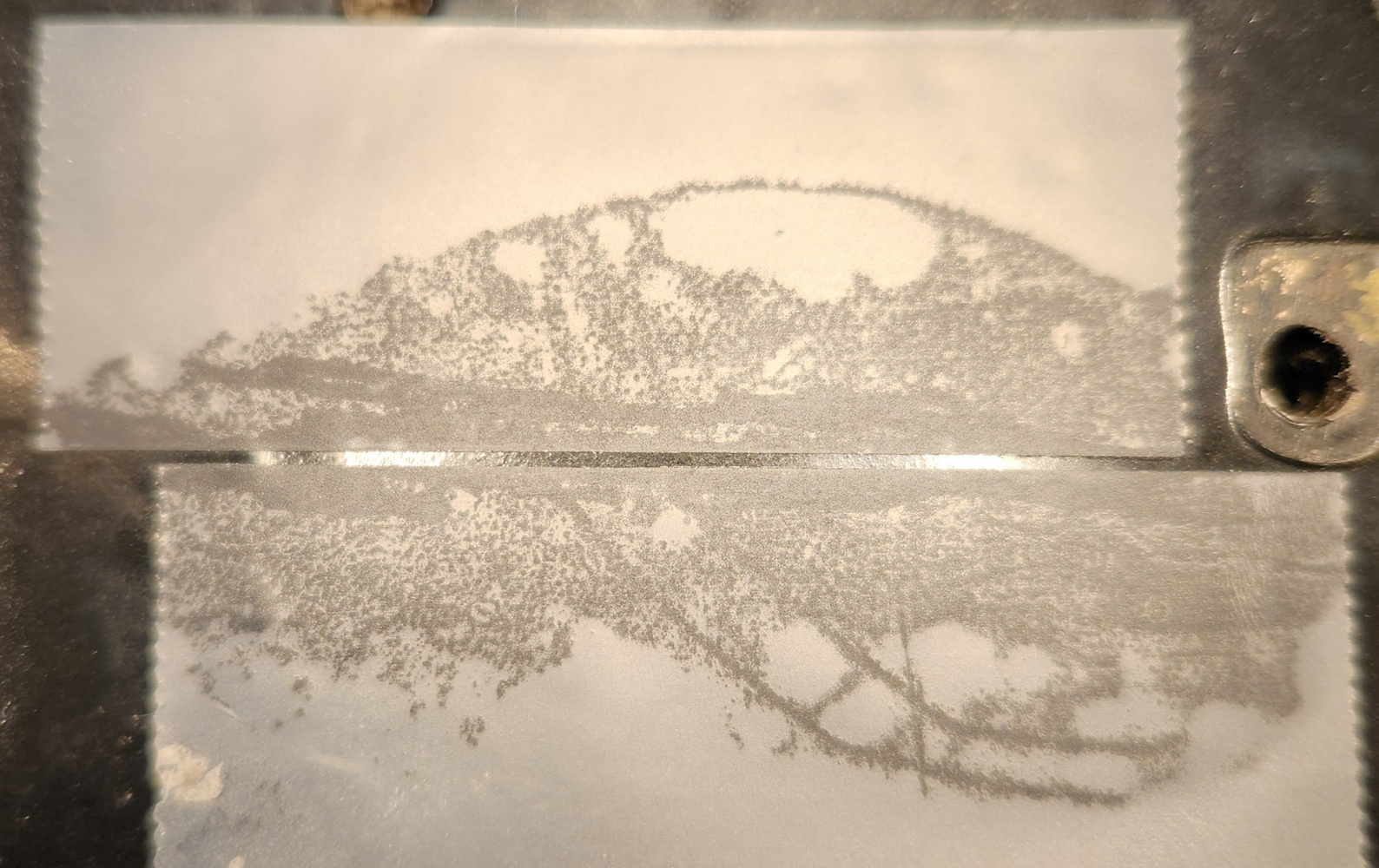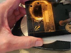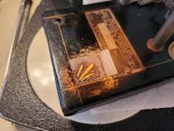 Before you begin, you need to have another Vibroplex bug that has at least one of the gold "florets" in good condition. The restoration procedure involves making a stencil by tracing over a good gold floret with a sharp pencil. The base finish needs to be nice and smooth with no pitting in the area where the filigree will go, otherwise the restoration will not work properly.