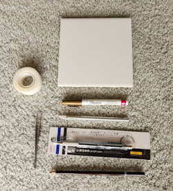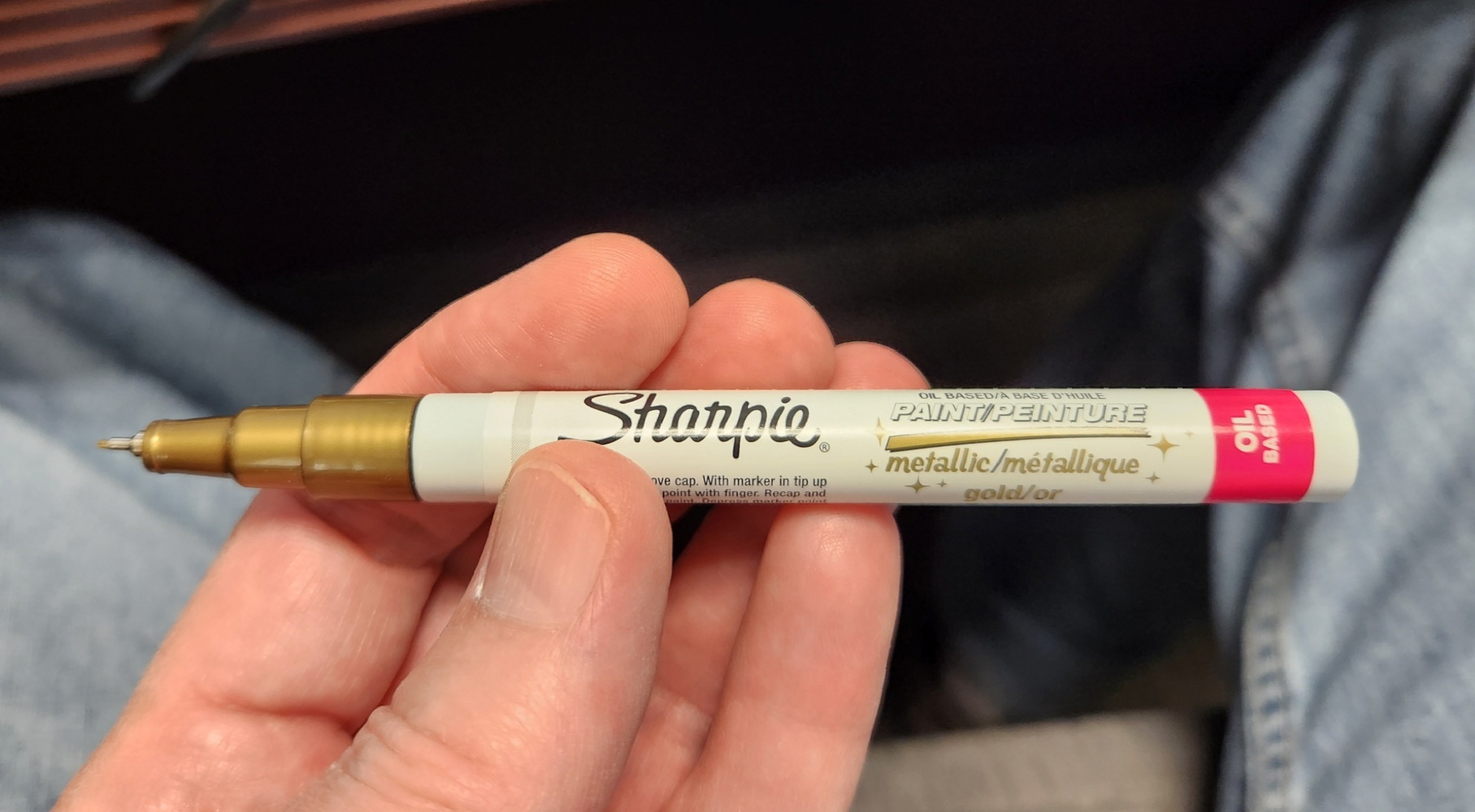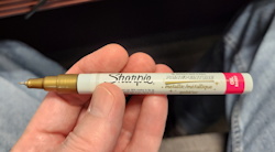 Next, follow the directions on the gold marking pen and rub the tip along the groove between the tape pieces, making sure the groove is completely filled with the gold paint.