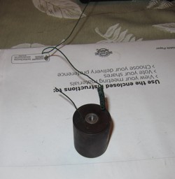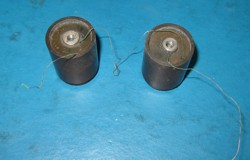 Here are 2 typical sounder coils viewed from underneath. Note that one end of the wire is close to the iron core (the inner part of the winding) and the other end is near the outer edge. |
