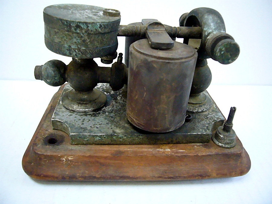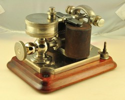Below is an example of an early sounder in which the finish on the wood base has deteriorated. The Shellac is completely gone and the wood itself is discolored and dried out. This is a prime candidate for re-finishing with shellac. Also pictured is the same sounder after re-plating the metal and re-finishing the wood base: